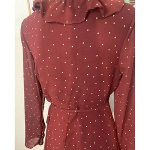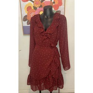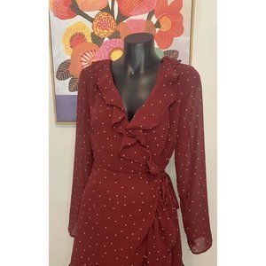 LA VIE BOHEME Burgundy Polka Dot Long Sleeve Frill Wrap Dress Sz 6