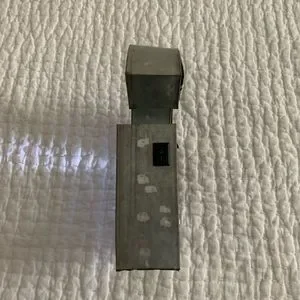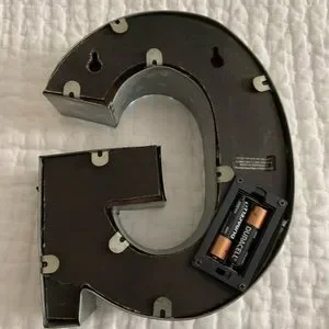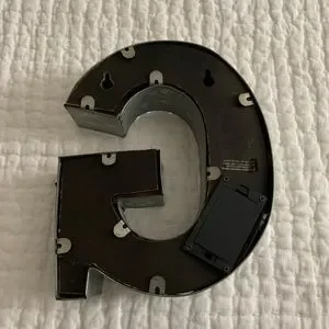 9 5/8” X 8” X 2 1/4” ROUGH METAL LETTER “G” WITH LIGHTS. STANDS UP. SWITCH ON SIDE TURNS ON LIGHTS. TWO DOUBLE A BATTERIES. NEW. NEVER USED. PURCHASED AT HALLMARK.