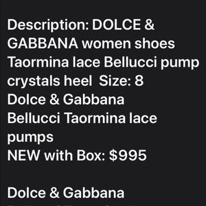 Dolce and Cabanna lace/Christal pumps Brand new still in the box wrapped in plastic and shoe bag, Have never been worn and cost $995. Please see the last four photos for full description of the shoes!! Bought from the Dolce and Gabbana store in Hawaii. If you are interested in these shoe please contact my friend Gina (see last photo) she is the owner of these shoes and I am just helping her sell them because I have all the followers and she has never sold on here before.
