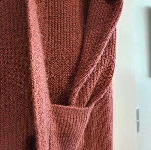 Material itself can get fuzzy and piles a little, but still great condition. No snags, holes etc. Open front style, two front pockets, soft. Darker rose pink color.