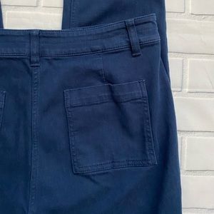 Perfect for work or a day out! These J. Jill pants feature a skinny ankle length fit with dark blue material. Front slash pockets with additional utility pocket and button detail with back pockets.