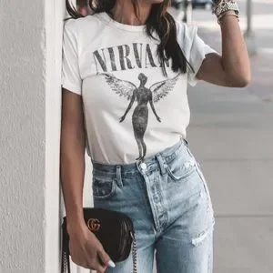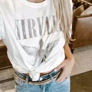 Vintage styled band tee ‘Nirvana’ with winged angel. Soft comfortable material with a little stretch.