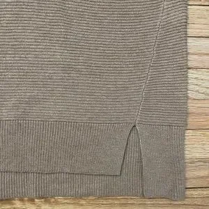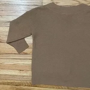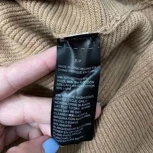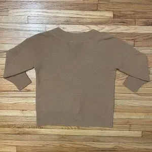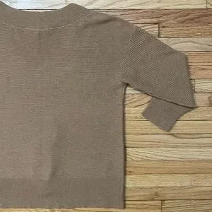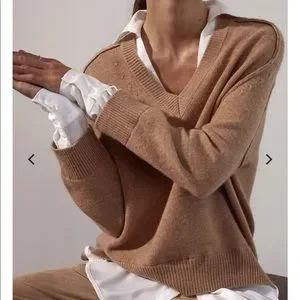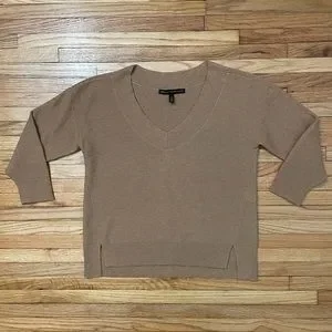 White House Black Market brand. Tan V-neck Sweater. Cotton & Wool Blend. Some wear throughout, overall good condition. Size Small. Actual Measurements: shoulder to shoulder 20 1/2”, pit to pit 18 1/2”, length in from 21”, length in back 22 3/4”, & arm length 15”. Model photo to show style only.