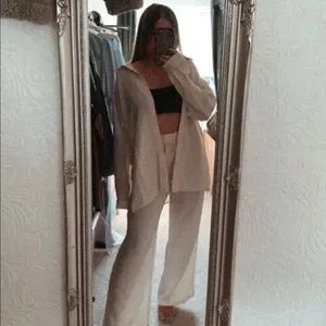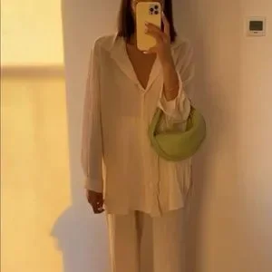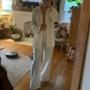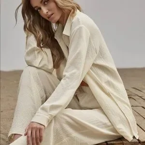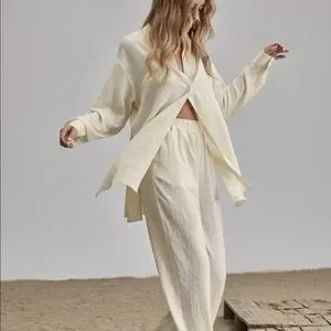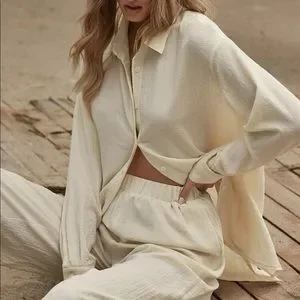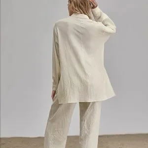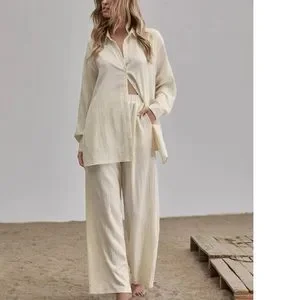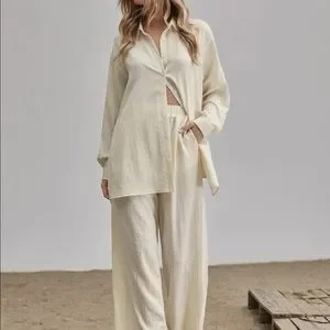 Shirt Pants 2 PC SET wide leg loose button collar spring summer womens cream