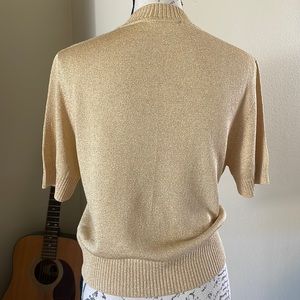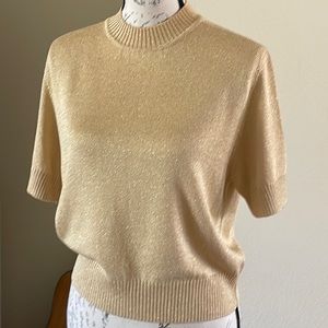 ST. JOHN Basics gold short sleeve pullover sweater. Much more than basic, shimmering gold flecks, ribbed crewneck, hem and cuffs and made in the USA. A true showpiece for any wardrobe and versatile staple for any season.