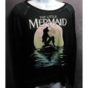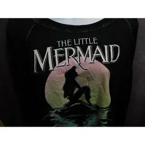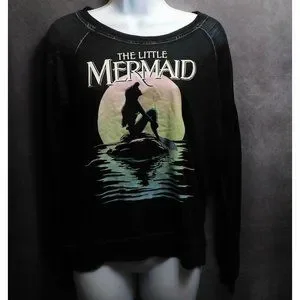 Adorable black Little Mermaid sweatshirt. It's made from a super soft black material, that is somewhat see through. It has a silhouette of Ariel sitting on a rock in the ocean, with a rainbow moon, and the title of the film. It has a wide neck, making it great for one-off shoulder looks. This is perfect for cool spring evenings, and is the perfect sweatshirt for any Disney princess fan!