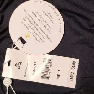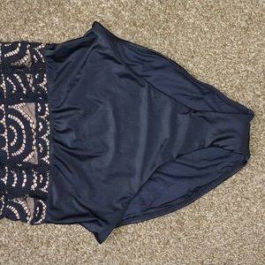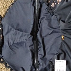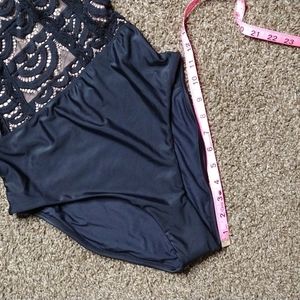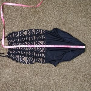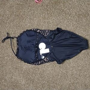 NWT. PQ. mid high Neck Lace One Piece Swimsuit. size Large. removable cups. black lace detail with nude underlay. 86% polyamide 14% elastane. smoke free home. please see pictures for measurements and stock model photos.