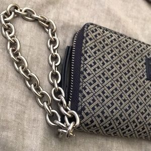 Pre-loved Tommy Hilfiger wallet with clutch chain. Silver hardware. Zip all the way through with three compartments. TH Monogram print throughout. Size: 17cm x 10cm Shows some slight wear to the material, but unnoticeable due to the nature of colour and print.