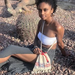 Boho fabric crossbody bag with knit string and flowers and fringe. 10"×9"
