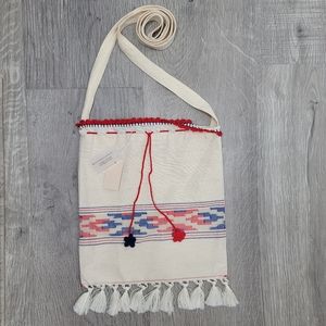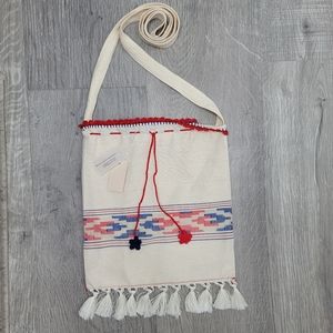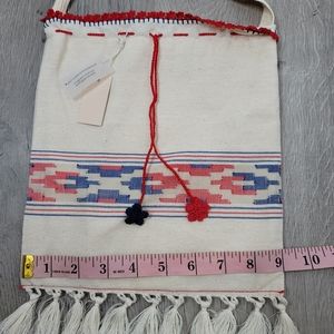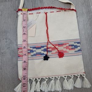 Boho fabric crossbody bag with knit string and flowers and fringe. 10"×9". cream red blue.