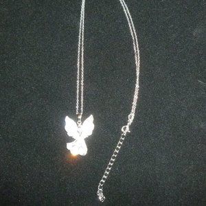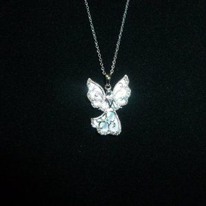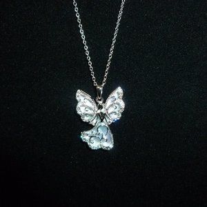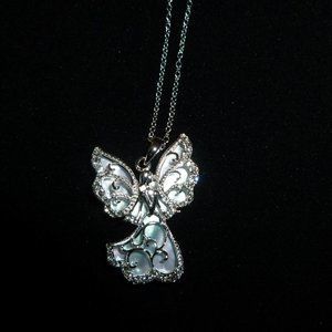 Hi. I bought this from HSN many years ago and never wore it. It is a beautiful Michael Anthony Angel Pendant. It is sterling silver and comes with the chain. The chain is 18", spring ring clasp and has a 2" extender. The angel is sterling silver with mother of pearl shell behind it that gives this a heavenly glow. The angel has a nice weight, and, on the back, it says "Always by your side". The angel measures about 1" long and about .75" across the widest part of the angel's wings. This is truly a beautiful pendant and should be worn. Comes in the original box from HSN. Smoke free home.