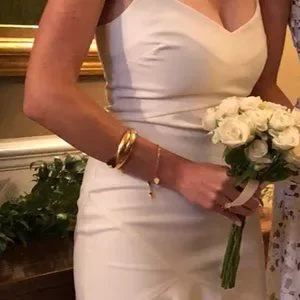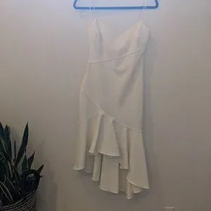 This white sexy midi dress comes with spaghetti straps, sweetheart shaped neckline, and an a symmetrical ruffle design flare. Flattering the body with its scooped neckline and fitted waist. Dare to be bold? This white dress will make a statement! Size 2, Likely brand. Worn one time only, in the pix above as a bridesmaid. Would be great for a rehearsal dinner for a bride!