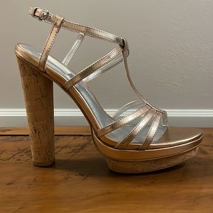 NWOT rose gold leather & cork high-heeled sandals, size 8 with 5.5" heel hight. Designed by Kate Hudson for Ann Taylor. Comfortable elasticized buckle closure and block heel. Shoes are in pristine condition with no visible wear to the footbed, straps or sides/back of cork heels; minimal wear to soles (they have never been worn outdoors).