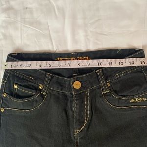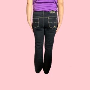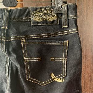 Original Von Dutch bootcut stretchy mid rise jeans . Black in color with golden stitches in the pockets . Worn couple of times . No damages in a good condition.