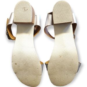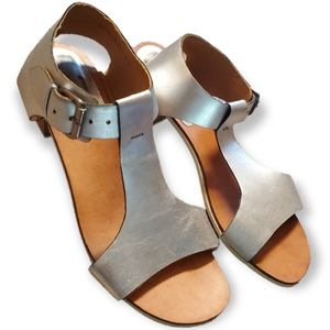 A Détacher | Highsmith T-Strap Silver Sandals Short Heel Size 9 Leather Wood