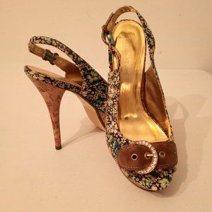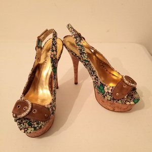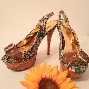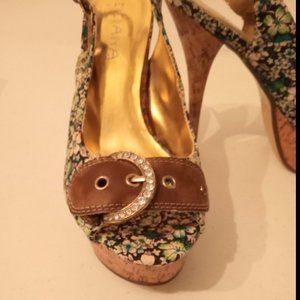 These shoes are amazing because they have it all . It's hard to find a pair of shoes that would satisfy all tastes in one. It has a metal accent with rhinestones, faux leather buckle and accent, floral summer print, cork-like platform and heels and more. These shoes would fit with anything & everything: jeans with top, summer floral dress, or solid color dress be it green, yellow, beige, white , etc. Absolutely beautiful shoes!