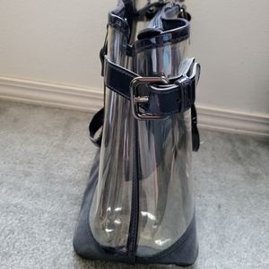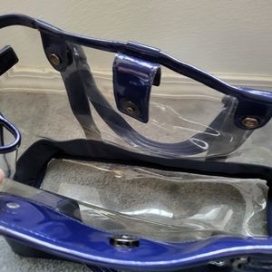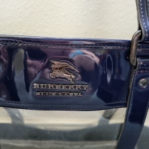 Authentic Vintage Burberry Blue Label Vinyl Clear Double Handle Tote Bag. Blue edges are patent leather. Very Rare. In very good condition with minor flaws as pictured. Measures 18" Wide x 6" Depth x 10" Height. No long strap. Comes with removable snap-on pouch
