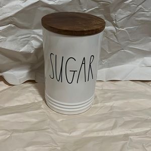 Rae dunn sugar cellar with wooden top. Ribbed at bottom. Matches with ribbed canisters that say powdered sugar, flour, and cocoa.