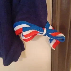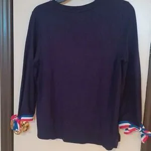 Crown & Ivy petite 3/4 sleeve knit top. Cute red/white/blue ties at sleeve ends, notched on both sides of hem pull over. Navy knit that measures pit to pit 20 inches and from shoulder to hem 23 inches. Perfect condition only worn twice.