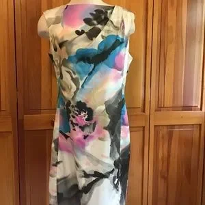 Fully lined Ann Taylor print dress in soft watercolor greys, blues, and pinks. Sleeveless with asymmetrical neckline.