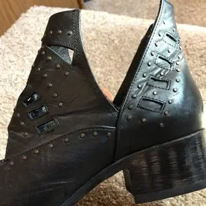 Absolutely gorgeous, never worn more than in the house wishing they fit better 😅😭 No size shown anywhere, but I’m typically a Women’s 9 in Vans for comparison, and these technically DO fit, just my toes are little too wide for the point. Black leather (possibly/probably faux) with little bronze studs all over.