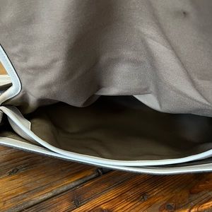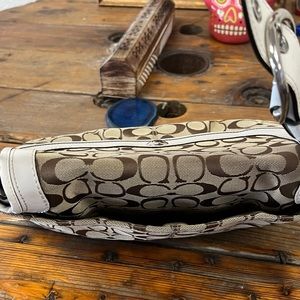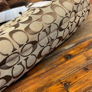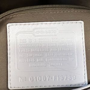 This is a beautiful bag. The off white sets off beautifully with the tan jacquard. Glossy Silvertone hardware, COACH button log on a magnet snap flap. Wider strap for more comfort. Spotless inside. Outside side pouch and 2 inside including the standard zipper pouch. Beautiful bag!!