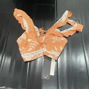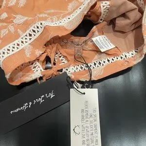 Add a little sparkle to your closet with the For Love and Lemons Mia Crop Top. Designed on a rayon crepe, this stunning peach babe features intricate embroidered tulle details, contrast inset trims, and an adjustable tie closure for a soft romantic touch. Looking your best is effortless in this open back number and the cascading ruffle straps give this peach and white crop top some major sex appeal.