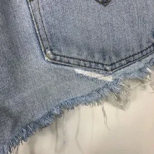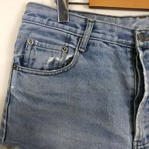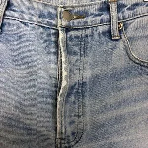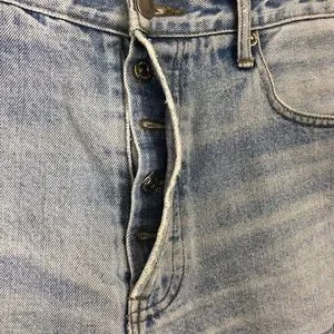 Light distressing details throughout. Raw hemline. Button fly is missing two of the buttons.