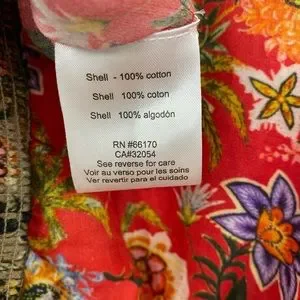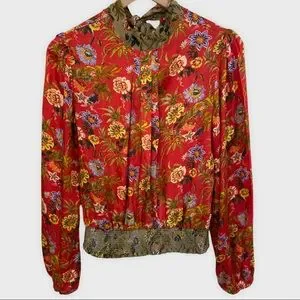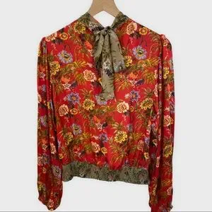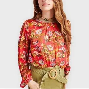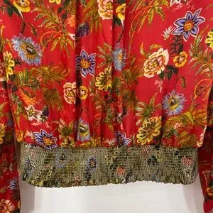 Nikasha red floral Toscana Peasant Blouse from Anthropologie. Ties at neck in back. Elastic smocked band at waist.