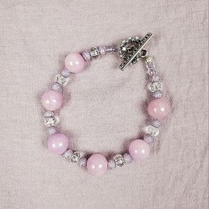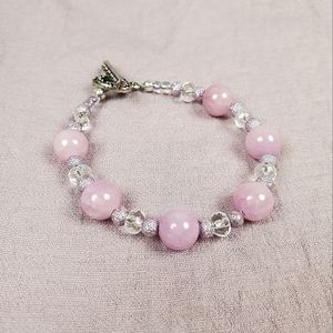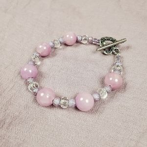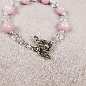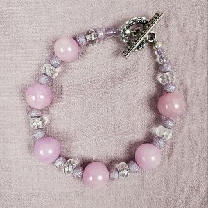 This bracelet is hand crafted with lavender stone, faceted crystal glass, and light purple textured beads. Heart shaped silvertone toggle style clasp. Interior circumference is 6 1/4" total length is 7 1/2".