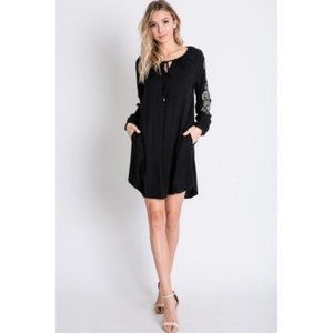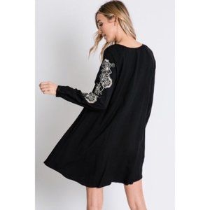 SELF: 100% RAYON LINING: 100% POLYESTER. BAROQUE FLORAL EMBROIDERY ACCENT SLEEVE DRAWSTRING NECKLINE KNIT SHIFT DRESS.