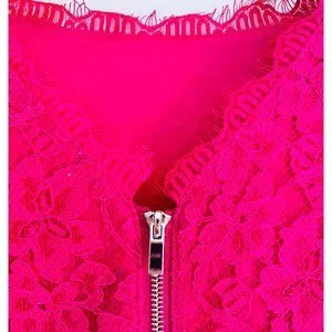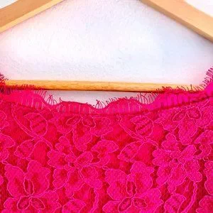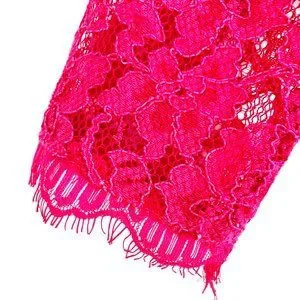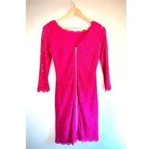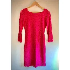 Classic DVF Lace dress in fuschia. Size 4. Scalloped boatneck with 3/4 length sleeves and V-back. Length hits above the knee. Very good condition.