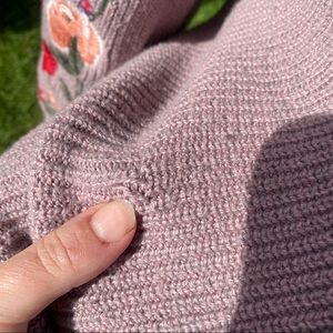 Gently used American eagle mauve colored V-neck sweater with embroidered flowers down the sleeves. More of a balloon sleeve. Has one little pull on the front as shown. But it can easily just be pulled back to the inside and hidden. Just couldn’t find my crochet hook to do it.