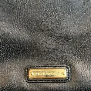 VGUC black ‘leather’ adjustable strap crossbody, or shoulder bag, with gold detail, interior and exterior pockets, and zip closure.