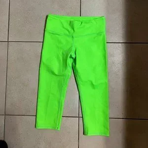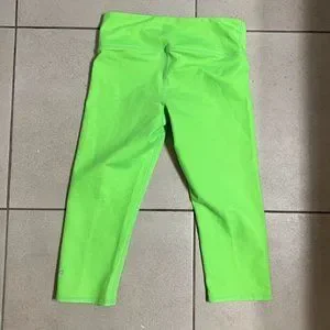 Neon green ALO Yoga cropped leggings, size XS. Thick cotton & spandex material, definitely pass the squat test. Only worn a few times before I outgrew them, good condition. There is a tiny bit of pilling starting to happen on the back side, but a fuzz buster can knock that out real quick.