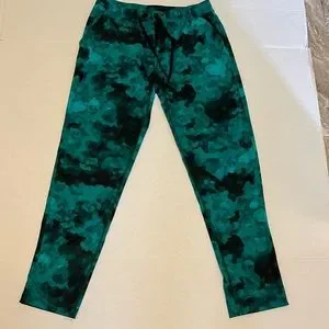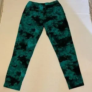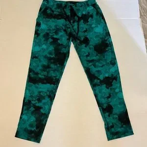 Pants. Green/ black print. Two side pockets, inside net pocket, two back pockets, still sewn closed. In good condition no rips tears holes or stains or pulling. No tag. Measured flat waist 14” rise 10” inseam 25” leg opening 5 1/2”.