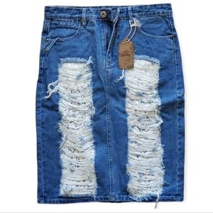ChiQle Denim Skirt Destroyed Ripped Lace Patch
