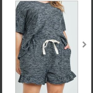 Gray ruffle short sleeve waffle knit top with matching shorts. Shorts have an adjustable tie in the waist band and pockets. Material is 60% polyester, 35% rayon, and 5% spandex.