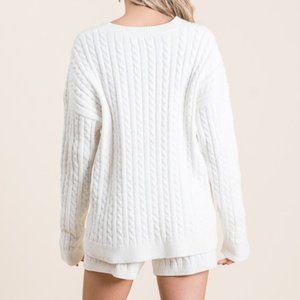 Introducing our Cable Knit Soft Chenille Lounge Set, a must-have for the colder seasons! Made from super soft and high-quality materials, this lounge set offers ultimate comfort and warmth. Perfect for Fall, Winter, and even Spring, this set is versatile and can be worn throughout the year. Complete your cozy look by pairing it with our faux fur slippers and long socks, available in our boutique. Stay stylish, comfortable, and cute with this extra cozy lounge set.