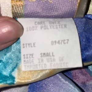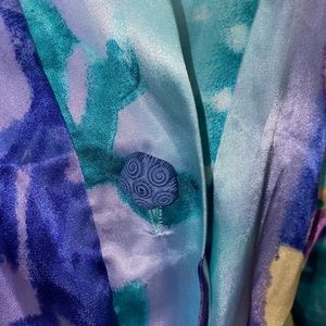 Two piece robe has shoulder pads, a small button and a ribbon to tie around.