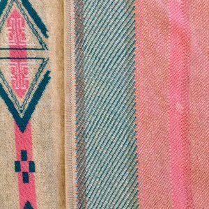This woven cotton ruana from Sundance is a versatile cover-up to wear. Similar to a poncho, the garment is cut as a large square of fabric with an opening in the front. You can wear it long and flowy or drape one side across the opposite shoulder to wrap yourself up. The outside fabric features vertical stripes of aqua, pink, tan, and cream, while the inner face shows a dynamic geometric pattern against the cream. The inside pattern peaks through as you move and walk. Despite the prominent colors, its base of natural tan means the piece is relatively neutral and can be worn with lots of other colors. It’s sizing is universal and accommodates many body shapes. In excellent preowned condition.