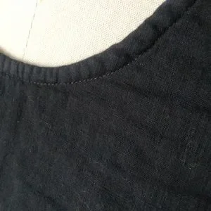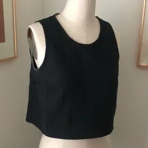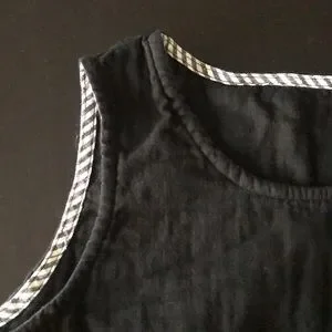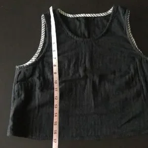 Gauzy black cotton fabric in a swingy silhouette, perfect for hot summers or layering. Tank Top has slight scoop neck, cropped length (Great with high-waisted shorts or to show off that midriff!) and cute striped binding on the inside of the armholes and neckline.