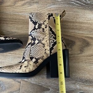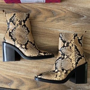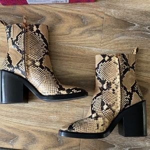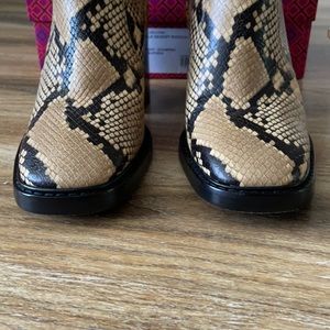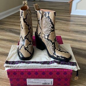 Tory Burch Heeled Ankle Boot Stamped Snake Printed Leather Pale Desert Roccia. Size 8.5. From 2021. Some minor signs of wear: interior brand logo faded, some creasing to leather and light wear on soles and heels. Please see all pictures. Comes with dust bag and box.