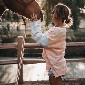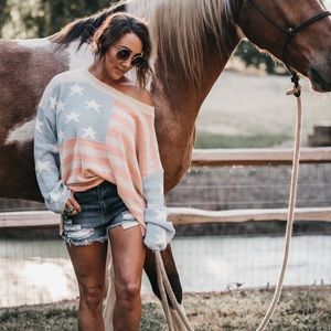Our Merica' sweater is a light weight blend fabrication perfectly made for cooler Summer nights. We love the pastel pink and blue flag design of this must have piece. It's our pick for your next 4th of July outfit!