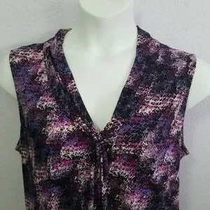 Tahari Printed sleeveless top is in great condition! The base of the top is black with shades of purple, pink and white. The top has a vneck and a little cute tie detail. Pair this with some black shorts and sandals and be good to go! The pictures are part of the description above. If you have any questions I will be happy to answer them for you! Happy poshing to you!
