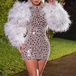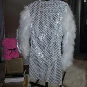 *New* Momycharm Sequin Prom Sparkly Dress Long Slve Mini Wte Feather Dress Sz.M