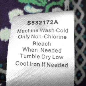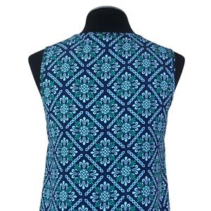 Solid woven fabric with a navy-blue and aqua diamond floral mosaic pattern throughout. Sleeveless button-down style top with a v-neck cut and crochet detailing in front. Top is in excellent condition with no flaws. Originally sold on Stitch Fix. Feel free to ask questions. Save more with bundled items!