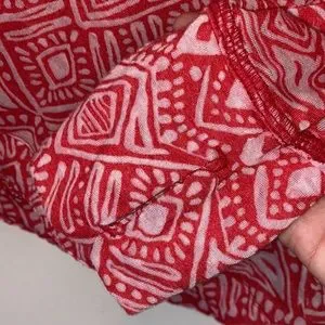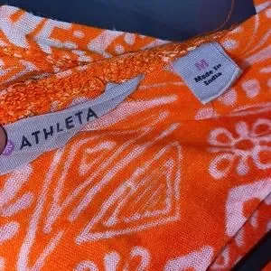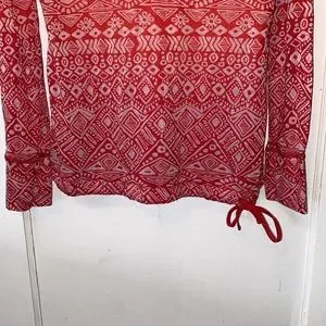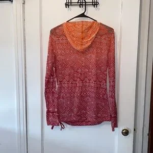 Athleta Hidden Lake Deep Red Firestone long sleeve hooded top. Ombré design in red to orange. Swoop neckline. Drawstring tie at the waistband. Thumbholes. Size medium. Pit to pit approx 19.5 inch. Used but in great condition with no rips or stains. 6