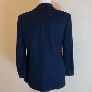 Pendleton size 10 navy blue wool suiting jacket. One button front closure. Faux buttons on front give four button appearance. Made of 100% virgin wool. Armpit to armpit measures 21 inches. Top of shoulder to bottom measures 29 inches. This classic blazer is cut more generously. Excellent used condition.