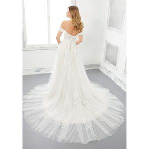 Size 14. This dress was a sample gown from a high end bridal salon. It's in excellent condition, except it's missing one of the off-the-shoulder sleeves. It does come with one of them, so a seamstress should be able to replicate it. Or the gown can be worn as a strapless dress! Price has been reduced accordingly. Retail price: $2,395